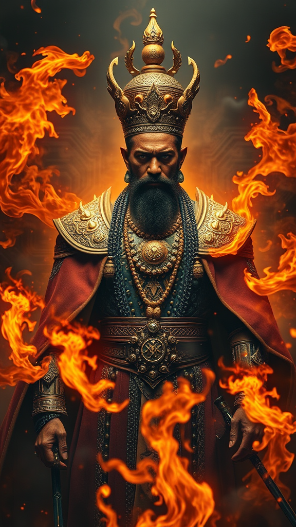 A fierce monarch embodies the essence of fire, standing boldly amidst spiraling flames, enveloped in a mysterious fog and mist. His features are strikingly perfect and intensely realistic. Adorned in elaborate, intricate garments that reflect a fusion of technology and tribal elements, the scene is set against a circuit board backdrop. This king commands a dark fantasy realm with grace, captured in an awe-inspiring cinematic illustration reminiscent of an ArtStation masterpiece. The artwork is hyper-maximalist, overflowing with detail, rendered in 8k ultra-detailed quality using 3D Octane techniques. The composition boasts sharp focus and precision, with dramatic shadows and lighting enhancing the scene, making it ideal for a high-definition wallpaper.