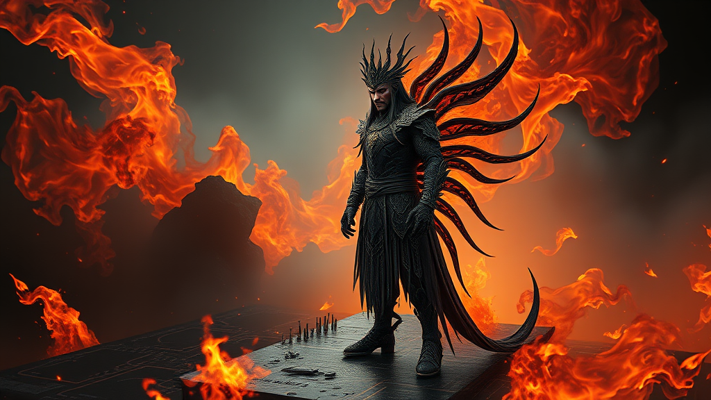 A fierce monarch, the master of flames, emerges from the swirling inferno, set against a backdrop of fog and mist. His visage is flawless, exuding power and allure. He stands firm, full-bodied on a surface reminiscent of a circuit board, clad in intricately designed, fantastical attire. This artwork is a grand piece meant for a gallery on ArtStation, blending hyper-maximalist, overdetailed, cinematic tribal dark fantasy elements. Captured in ultra-high-definition 8k resolution, it features ultra-detailed quality in a 3D Octane Render style, presenting a photorealistic concept with sharp focus and perfect composition. The piece is enveloped in intense shadows and dramatic lighting, making it ideal for a high-quality, high-definition wallpaper, presented in HDR.
