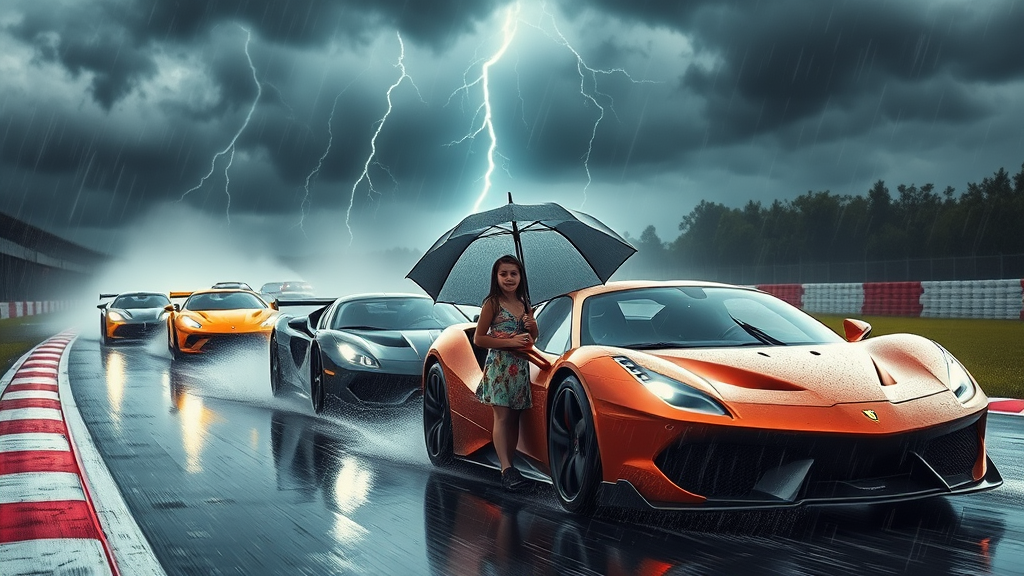 A fierce race unfolds as sleek cars zip around a rain-soaked racetrack, their tires spraying water into the stormy air, competing against the elements and each other. In the background, a young girl stands resilient under an umbrella, her face a mix of awe and determination, as lightning illuminates the turbulent sky, highlighting the thrill and chaos of the intense scene.
