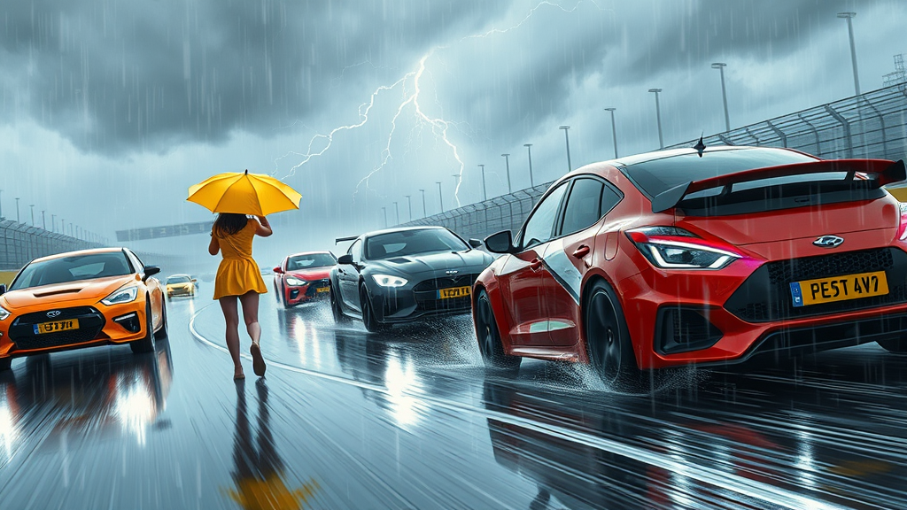 A fierce race unfolds on a rain-soaked racetrack with sleek cars like the Swift battling the elements, their tires skidding on the water-slicked asphalt. Thunder rumbles in the distance as sheets of rain obscure the view, creating a sense of chaos and speed. In the background, a realistically detailed girl stands under a bright yellow umbrella, her expression a mix of awe and excitement, her hair whipped by the wind as she watches the race unfold amidst the stormy weather.