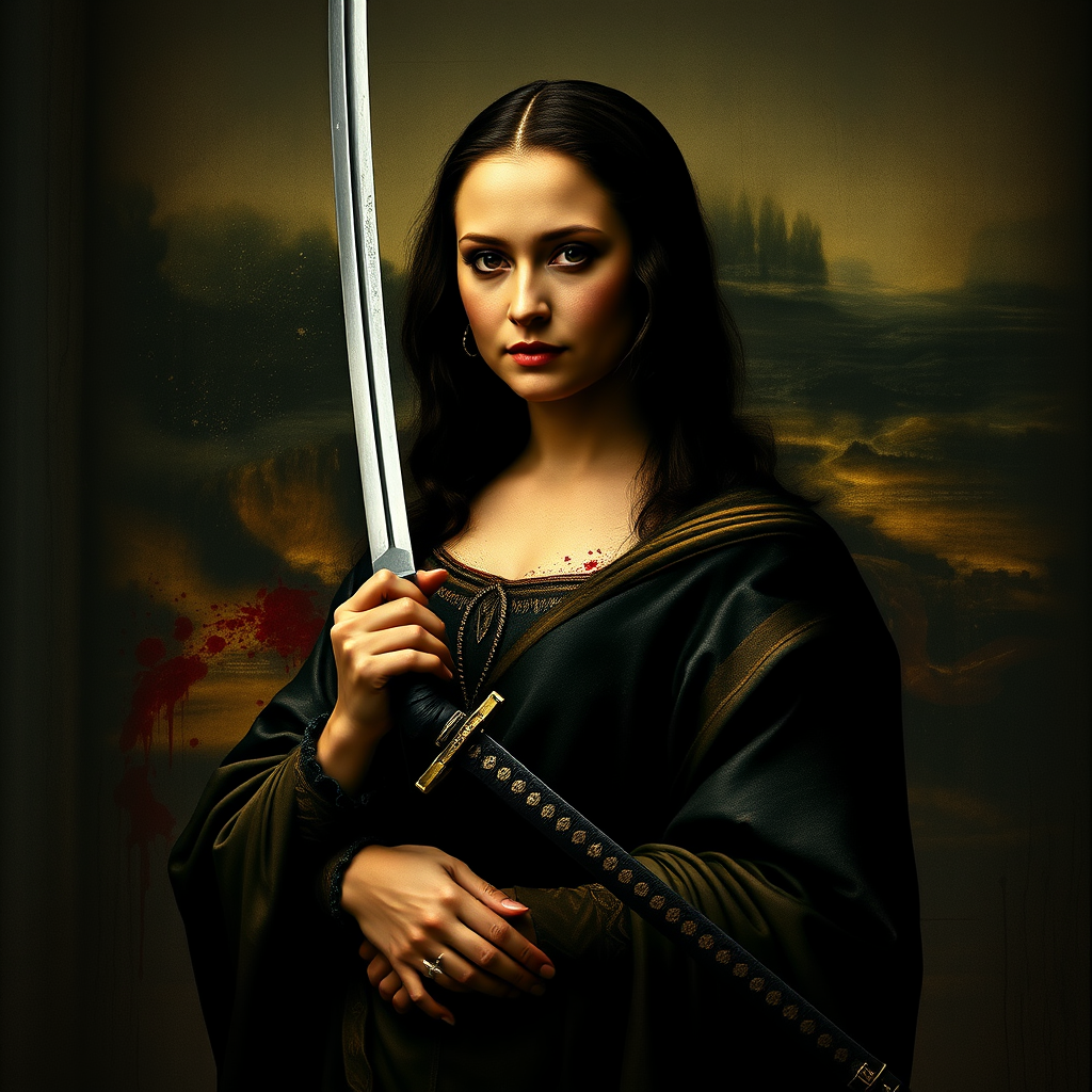 A fierce reinterpretation of Mona Lisa directed by Quentin Tarantino, with a gritty and cinematic flair. She stands confidently, locking eyes with the camera, clutching a katana with determination. The scene is realistic and meticulously detailed, capturing the essence of a masterful film still. Splashes of blood in the background tell a story of a recent battle. The atmosphere is intense and ominous, set in a 9:16 aspect ratio with a dramatic saturation level of 600.