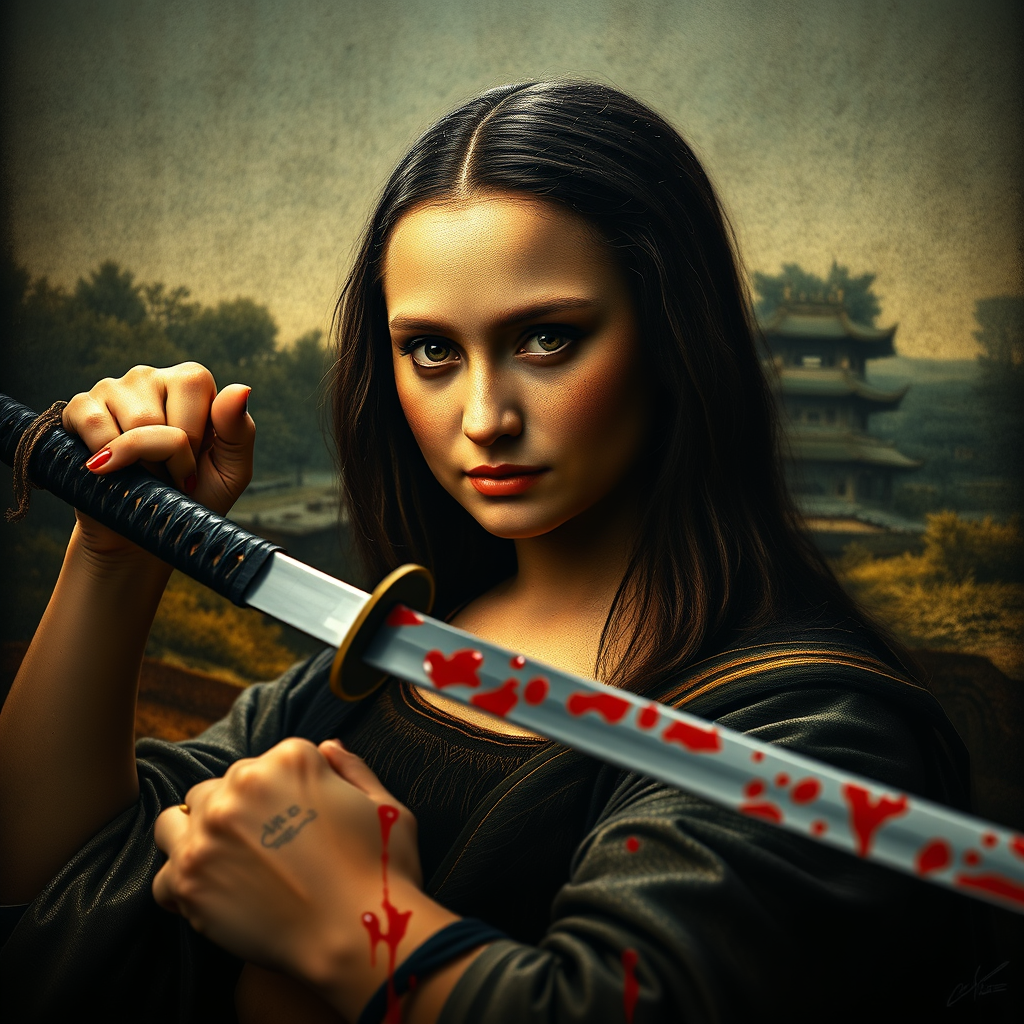 A fierce reinterpretation of the Mona Lisa, directed by Quentin Tarantino, in a cinematic and realistic style, intensely detailed with her eyes locked onto the camera, wielding a katana with precision, surrounded by a scene of controlled chaos and streaks of blood, presented in a narrow 9:16 aspect ratio, with a suspenseful atmosphere and high intensity.