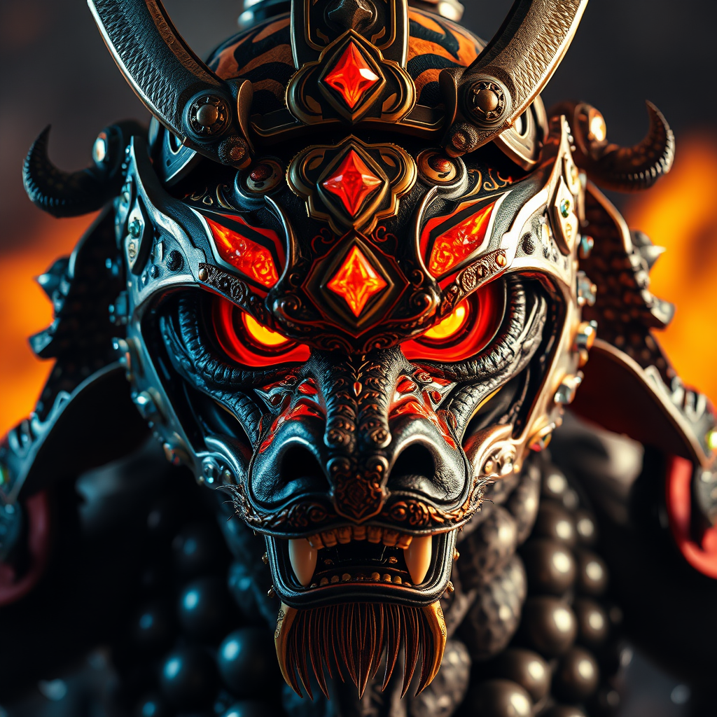 A fierce samurai dragon with flaming eyes, surrounded by shimmering crystal stones, dons a helmet with striking tiger-like patterns. Captured in a close-angle shot, this scene is rendered in 8k ultra-realistic detail, showcasing photography-inspired lighting and intricate textures that bring the mythical creature to life, emphasizing its majestic and formidable presence.