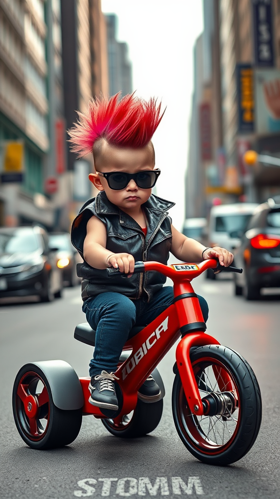 A fierce toddler with an aggressive expression rides a sleek red cyberpunk tricycle on a bustling city street filled with traffic. The toddler sports a vibrant punk rock mohawk and a stylish leather vest, exuding a confident and rebellious attitude. The tricycle boasts three futuristic wheels, adding to its edgy appearance. The toddler flaunts a pair of bold sunglasses, embracing the adventurous vibe of the urban landscape.