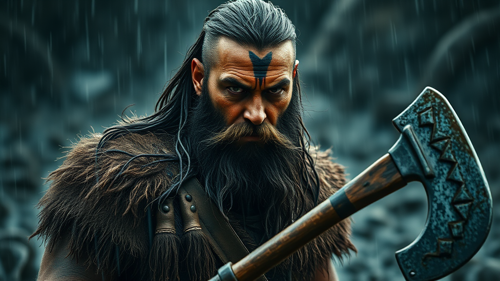 A fierce Viking warlord journeys to Valhalla, adorned in ominous warpaint, a tangled black beard framing his face, eyes blazing with fury. A prominent scar cuts across his weathered skin as he wields a mighty Viking ax. The scene is bathed in cinematic lighting with volumetric rays piercing through, creating an atmospheric and moody landscape. Rain-soaked, the warrior stands amidst dripping mud, embodying an epic and timeless battle spirit.