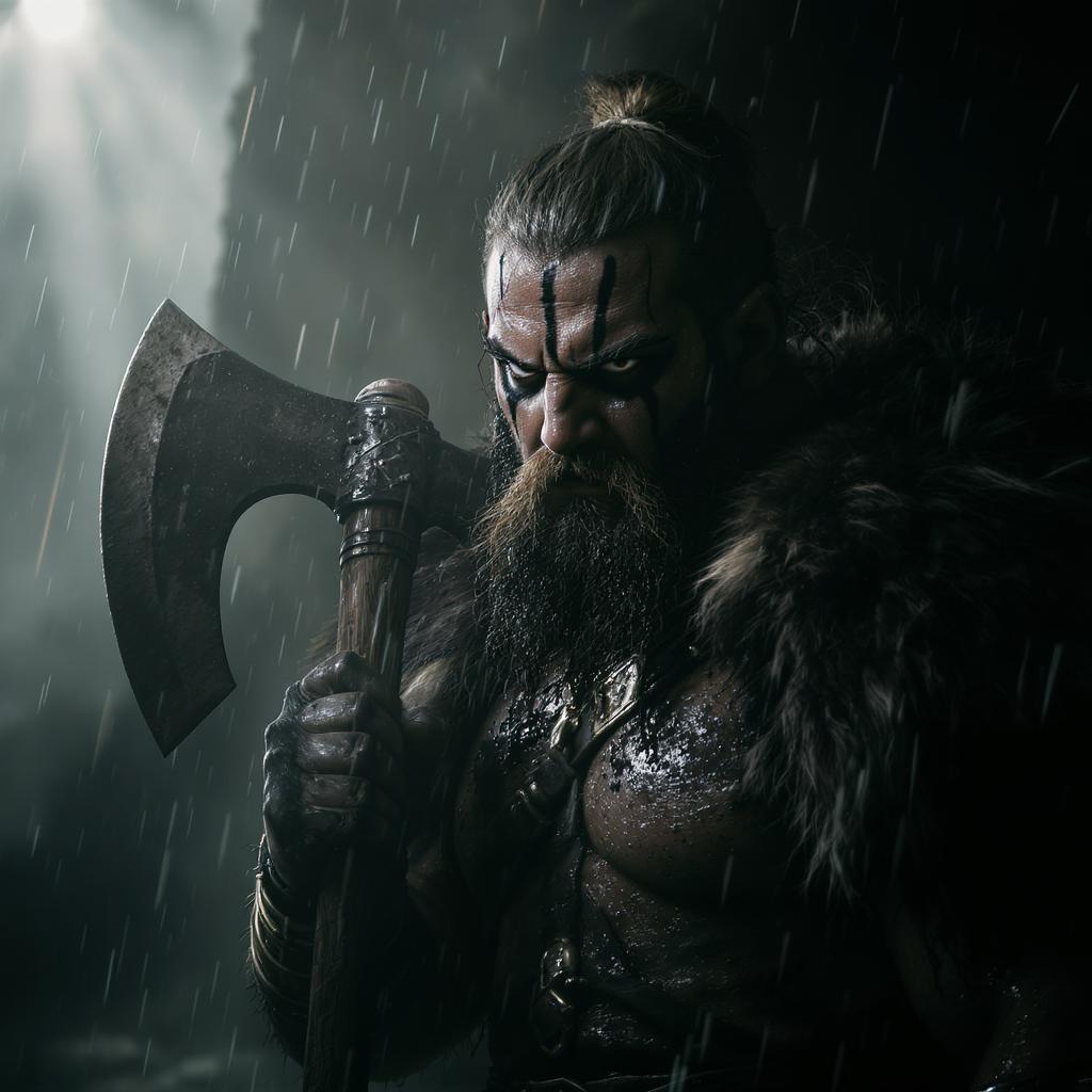 A fierce viking warrior king journeying to Valhalla, adorned with dark warpaint and a scruffy black beard, his face etched with an angry expression and a prominent scar. He grips a formidable Viking Axe, highlighted by cinematic lighting and dramatic volumetric rays. The scene is moody and atmospheric, with the warrior emerging from the shadows, his figure specked with wet, dripping mud, evoking a sense of raw power and an untamed spirit.
