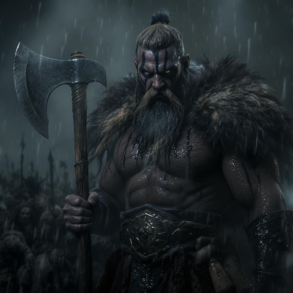 A fierce Viking warrior king journeys to Valhalla, his face adorned with dark warpaint accentuating a scruffy black beard and an angry expression. A prominent scar stretches across his face, telling tales of many battles fought. Clutching a mighty Viking ax, he stands amidst cinematic lighting with moody, volumetric rays cutting through the misty air. His body is cloaked in wet, dripping mud, each droplet glistening in the ethereal glow, adding to the intensity of his formidable presence.