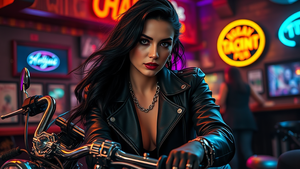A fierce villainess with cascading raven-black hair sits confidently on a sleek chopper motorcycle, adorned in a striking leather jacket embellished with intricate silver biker jewelry. Her gaze is intense and captivating as soft light dances across her features, revealing a subtle goth allure. In the background, a lively rock pub hums with energy, its neon lights casting colorful reflections. The scene is a hyperdetailed cinematic portrait, capturing the ambiance of warm bar lighting with intricate isometric details and bioluminescent hints. The atmosphere is richly complex, evoking an art style reminiscent of Greg Rutkowski, Artgerm, and WLOP, while infusing a unique pojatti realism. The composition is captured in a dynamic 32k UHD resolution, exuding an electrifying blend of rebellious spirit and ethereal elegance.