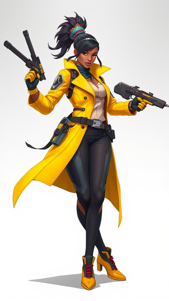 A fierce warrior in a sleek yellow coat, wielding dual weapons with precision, her design inspired by the dynamic energy of Overwatch character concept art. She embodies the elegance of Loba Andrade from Apex Legends, reimagined as an Overwatch hero. Her style integrates Afrofuturism anime influences, melding bright, futuristic tech elements with the grace of a tactical expert. Her presence captures the spirit of Brigitte's armor-clad strength, harmonized with Lucio's rhythmic agility transformed into a powerful female form. The vibrant and bold aesthetics echo the vivid worlds of both Apex Legends and Valorant, infused with the mystical aura of League of Legends' Senna, creating a uniquely compelling character who stands out in the arena with her confident stance and striking appearance.