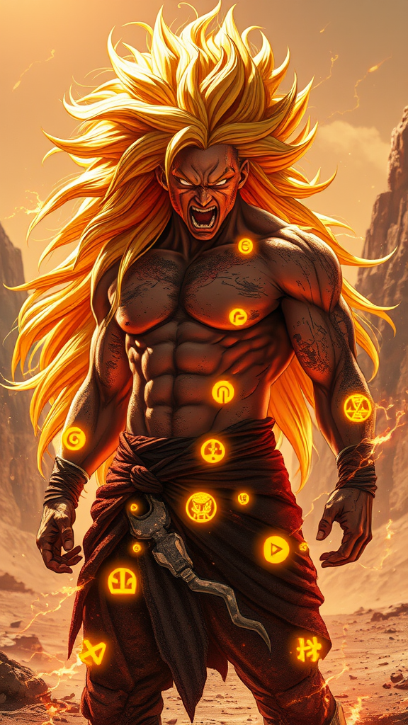 A fierce warrior reminiscent of a legendary Saiyan stands prominently, close-up, with extraordinarily long golden hair flowing with an ethereal glow. His face twisted in extreme rage, eyes burning with fury, he bellows a powerful war cry, summoning immense energy swirling around him. Battle-worn and battered, his body is smeared with dirt and blood, yet adorned with luminescent yellow runes pulsating in rhythm with his heartbeat. An intense aura, a blazing mix of orange and yellow reminiscent of fire, surrounds him, crackling with power. The backdrop reveals a desolate desert landscape, punctuated by jagged mountainous formations, enhancing the dramatic ambiance. Assuming a dynamic and epic action pose, his muscular form is silhouetted against a symmetrical composition, reflecting a fusion of futuristic glamour and mythical power. The image resonates with a redshift hue, drawing influence from energy-filled illustrations and the bold aesthetics found in DC Comics, set against spectacular and rugged terrain, where every element is charged with electric intensity.