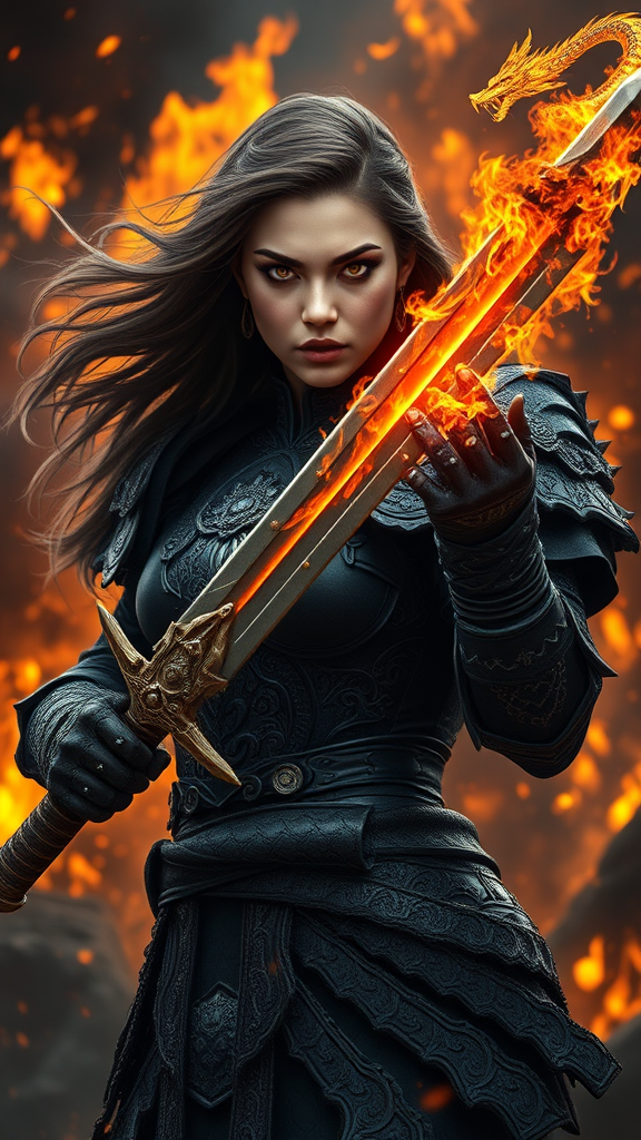 A fierce warrior woman clad in intricately crafted black armor, exuding an aura of dread and power, stands poised with a blazing sword of fire clenched in her grasp. Her human face is flawlessly detailed, framed by flowing long hair, with sharp, expressive features that reveal a depth of emotion and resolve. The armor is exquisitely adorned with dragon motifs, enhancing her imposing presence. Her eyes reflect the fiery determination of a seasoned fighter, set in a visage that is strikingly realistic and captivating. The character is captured in an epic pose, every aspect of her persona highly detailed from head to toe, against a backdrop roiling with fire and ash, casting an atmosphere of tension and majesty. The setting resonates with an undercurrent of horror and grandeur, offering a breathtaking visual in high resolution, a testament to the reality graphic art style.