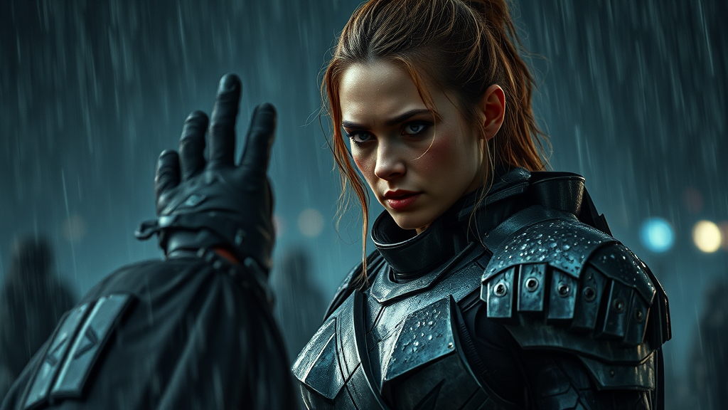 A fierce woman clad in futuristic armor stands amidst a stormy, rain-soaked battlefield, her suit bearing the scars of a relentless fight. The night is dark and the air charged with tension as she faces her adversary. Her face, bruised but resolute, reveals the determination of a warrior, every emotion captured in exquisite detail. The scene is cinematic, a masterpiece of photography that captures the essence of heroism. The environment is stunningly vivid, with intricate details that bring the dramatic atmosphere to life. The cinematic lighting enhances the hyperrealistic quality, casting shadows and highlighting the glistening drops of rain as they dance in lumen reflections around her.