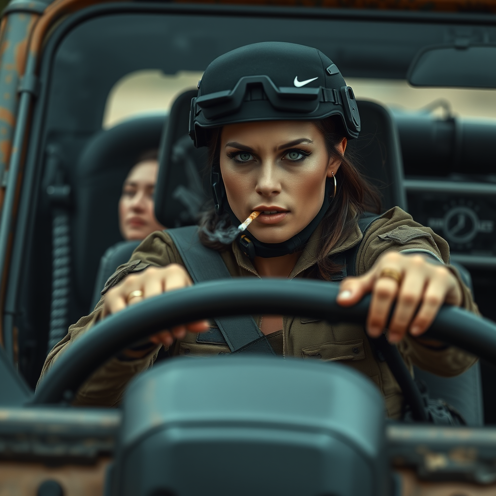 A fierce woman clad in tactical gear, her eyes sharp and steady, expertly maneuvers a rugged jeep through rough terrain, a thin wisp of smoke curling from the cigarette between her lips, hinting at her confident, no-nonsense demeanor.