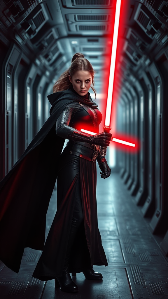 A fierce woman, embodying the dark power of a Sith lord, with glowing red eyes and a menacing aura, grips a red lightsaber in her right hand, angled sharply forward. Her black cloak flows around her as she stands in a commanding full-body stance, exuding anger. The dimly lit, metallic walls of a sinister spaceship hallway serve as her backdrop, casting ominous shadows that accentuate her formidable presence.