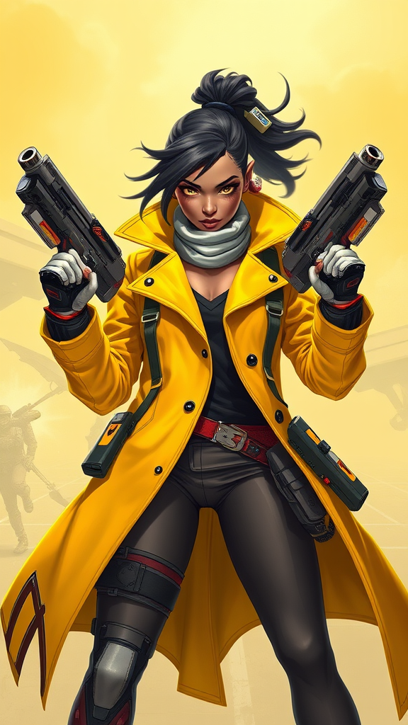 A fierce woman in a vibrant yellow coat, dual-wielding sleek futuristic weaponry, reminiscent of Overwatch's dynamic character style. She exudes the charisma of Loba Andrade with a dash of Brigitte's resilience, blending seamlessly into the bold universe of Apex Legends. Her look features the sleek, technological flair of Afrofuturism anime, with influences from the musical energy of a female Lucio. Her presence echoes the enigmatic aura of Senna from League of Legends, combined with the tactical edge characteristic of a Valorant hero, all woven into a unique character concept full of spirit and innovation.