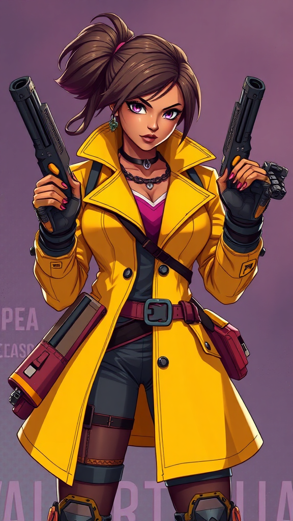 A fierce woman in a vibrant yellow coat, dual-wielding sleek guns, embodying the spirit of an Overwatch hero; exuding the poise and cunning of Loba Andrade from Apex Legends, reimagined with the stylish flair characteristic of Overwatch's universe. Her design merges Brigitte's strength with Lucio's rhythm, dressed in the dynamic aesthetics of apex legends concept art. She radiates the Afrofuturism essence of Senna from League of Legends, blending seamlessly with the vibrant, cutting-edge world of Valorant, manifesting an anime-inspired, tactical vigilante.