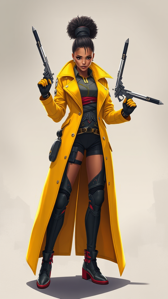 A fierce woman in a vibrant yellow coat, exuding confidence and poise, holds dual sleek weapons, inspired by the dynamic Overwatch style. Her character concept blends the enigmatic allure of Loba Andrade from Apex Legends with a futuristic twist, reimagined as if she belongs in the Overwatch universe. Imagined in the aesthetic fusion style of Apex Legends concept art and afrofuturism anime, she embodies the elegance of Brigitte with the agile energy of a gender-swapped Lucio. Her silhouette is reminiscent of strong, iconic figures like Senna from League of Legends and echoes the tactical style of a Valorant character, merging power and grace in a visually striking ensemble.