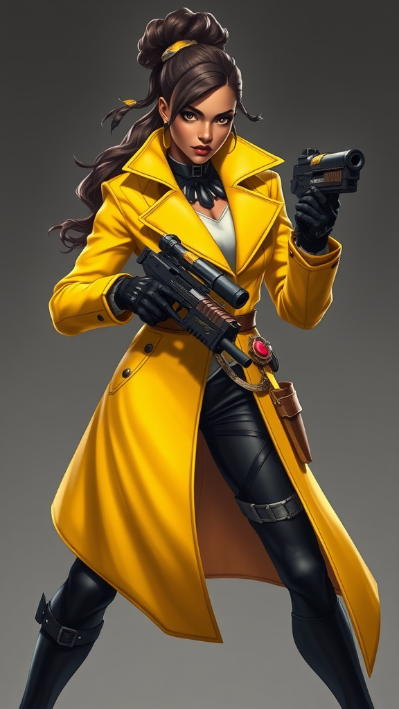 A fierce woman in a vibrant yellow coat, wielding dual guns, merges the elegance of Loba Andrade from Apex Legends with the dynamic energy of an Overwatch hero. Her design mirrors the sleek style of Apex Legends concept art with a touch of Afrofuturism anime influences. She embodies the agility of Lucio as a female character and the formidable presence of Brigitte from Overwatch, adorned with intricate detailing inspired by Senna from League of Legends. Her aesthetic carries the tactical edge of a Valorant character, creating an awe-inspiring and powerful figure in this imaginative universe.