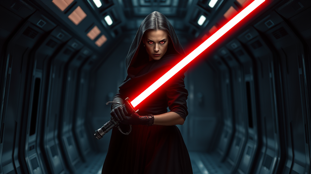 A fierce woman Sith lord stands in a dark spaceship hallway, her black cloak billowing slightly around her as she glares with intense red eyes. The red lightsaber in her right hand glows ominously, extending at a sharp 45-degree angle, casting an eerie crimson light on the sleek metallic surfaces surrounding her. Her posture is defiant, and her anger is palpable even from behind, where her full silhouette is visible. The hallway's dim, shadowy ambiance enhances the menacing aura she exudes, hinting at the power and determination she carries as she stands poised for confrontation.