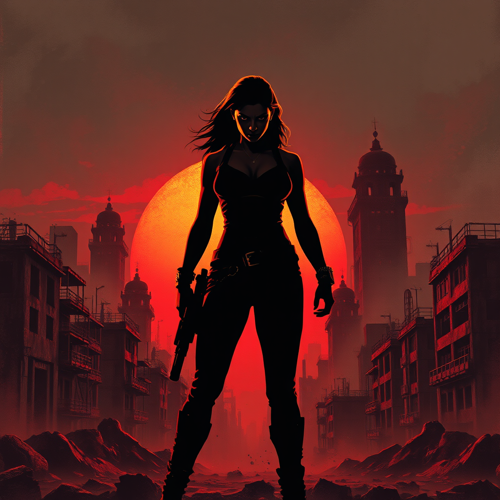 A fierce woman stands resolute in a dystopian cityscape, her silhouette framed against a gritty, dirty backdrop. The crimson sunset casts dynamic, dramatic lighting that accentuates her form in this high-contrast artwork. She embodies strength and defiance, her presence dominating the scene with a commanding aura reminiscent of brutalism. The city around her is a weathered and faded testament to a post-apocalyptic world, its architectural remnants echoing the gritty, raw essence of pulp novel art. In the style of Charles Coll and Frank Frazetta, the visual narrative unfolds like a comic-style, cinematic front-page cover, exuding a timeless yet time-worn atmosphere.