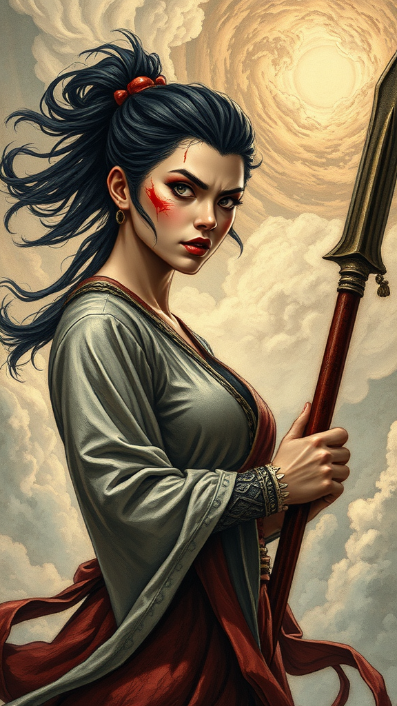 A fierce woman with an expression of intense anger, her face marked with streaks of blood, stands resolute. She grips a spear tightly, drawn from the rich tapestry of Chinese mythology. Above her, the sky swirls with intricate, detailed clouds, creating an abstract and ethereal backdrop that hints at an unfolding celestial drama.