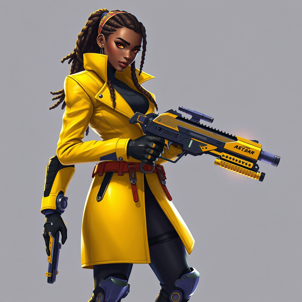 A fierce woman with braided hair stands confidently, dressed in a sleek, futuristic yellow coat that catches the light with a metallic sheen. In one hand, she wields a high-tech, dual-toned firearm, a fusion of curves and angles inspired by apex legends' design aesthetics. Her demeanor exudes the charisma and tactical acumen reminiscent of Loba Andrade, seamlessly integrated into the overwatch universe. Her combat boots and armor are intricate, inspired by the tactical yet flamboyant style of both Lucio and Brigitte. The vibrant palette and dynamic poses reflect the spirit of afrofuturism anime, channeling energy akin to Senna from league of legends, and the sleek elegance of a valorant agent. Her eyes hold a steely determination, blending the essence of each universe into a striking, unified character concept.