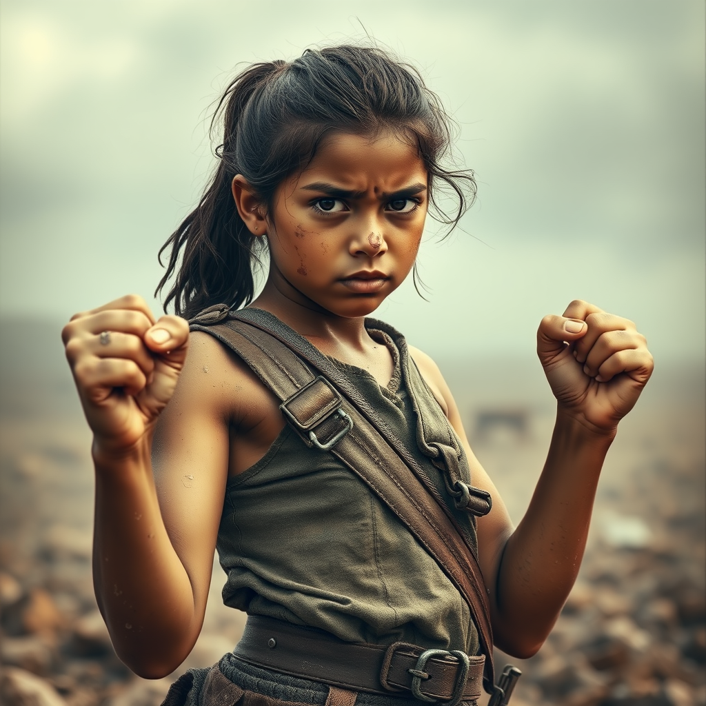 A fierce young rebel stands resolute, her stance strong and ready for battle, her face smeared with dirt and determination. Her eyes blaze with defiance as she raises her fists, her nose slightly runny, yet her spirit unwavering. Clad in worn but sturdy gear, she embodies resilience and perseverance, her form framed against a backdrop of a tumultuous landscape. She is a symbol of the relentless struggle, unyielding and courageous, with a tenacity that refuses to falter.