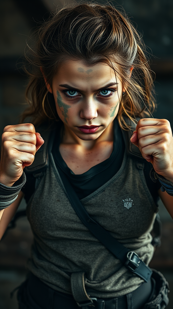 A fierce young woman, standing tall in a defiant stance, her face smeared with dirt, eyes blazing with determination. Her fists raised, ready to defend, she exudes a powerful resilience. Her hair, wild and untamed, frames a face marked by a runny nose, evidence of the battles faced. Clad in rugged gear, she embodies the spirit of rebellion, prepared to face any challenge that comes her way. The air around her buzzes with an electricity, a testament to her unyielding resolve and untamed spirit.