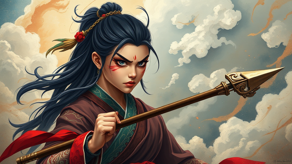 A fierce young woman stands determinedly, her face marked with streaks of crimson, eyes blazing with anger. In her grip, a spear is poised as if ready for battle. She is draped in the traditional garb of Chinese mythology, exuding an aura of ancient power and mystery. Above her, the sky roils with dramatic clouds, forming a tapestry of swirling patterns and vibrant colors. The abstract background hints at otherworldly realms, blending seamlessly with the mystique of her mythical presence.
