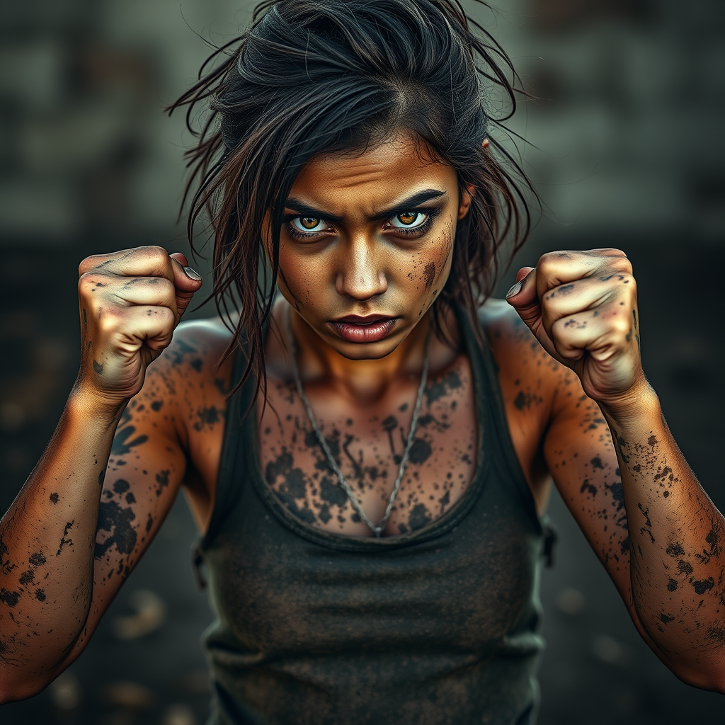 A fierce young woman stands in a defiant stance, her body coated in layers of grime, a slight trail of tears mingling with the dirt on her cheeks. With fists clenched and raised, her eyes blaze with unwavering determination, framed by tousled hair and a resolute expression, embodying the spirit of rebellion and resilience.