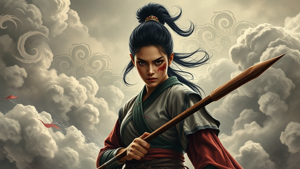 A fierce young woman with blood streaked across her face stands resolute and angry, clutching a spear against the backdrop of a mythical Chinese landscape. The sky is a tumultuous tapestry of clouds, with intricate patterns swirling in abstract forms, evoking the timeless essence of ancient storytelling.