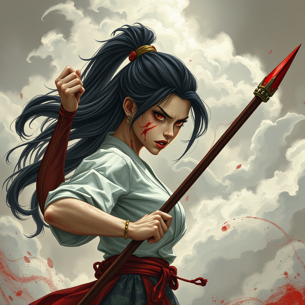 A fierce young woman with blood streaked across her face, eyes burning with anger, stands poised with a spear in hand. Her appearance is a blend of strength and grace, reflective of Chinese mythology. She is set against a dramatic, detailed sky filled with swirling clouds, creating an abstract and dynamic backdrop.
