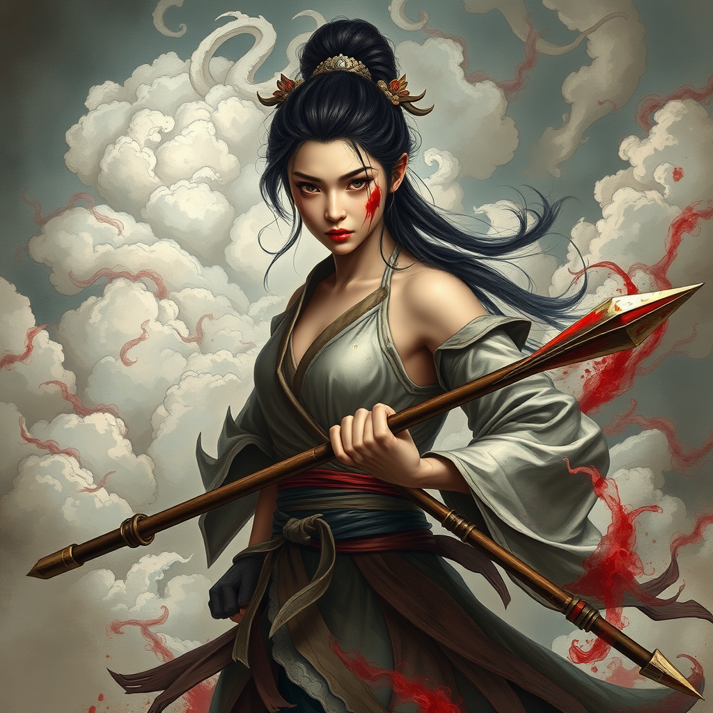 A fierce young woman with blood streaked across her determined face stands gripping a spear, embodying the essence of Chinese mythology. She is set against a backdrop of swirling clouds, the sky intricately detailed, weaving through an abstract and ethereal landscape.