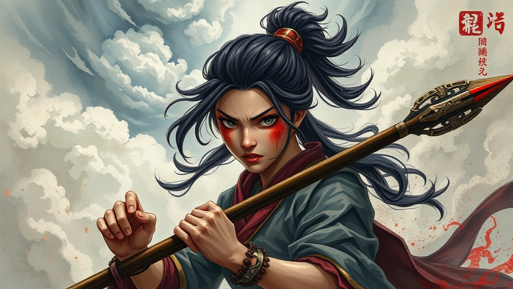 A fierce young woman with bloodstained cheeks stands furiously gripping a spear, embodying the essence of Chinese mythology. Her expression is intense, eyes burning with determination, as turbulent clouds swirl in the detailed sky above. The abstract background swirls with mythical patterns and colors, enhancing the mystical atmosphere surrounding her.