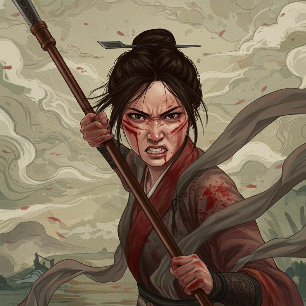 A fierce young woman with streaks of blood across her determined face tightly grips a spear, embodying the spirit of Chinese mythology. Her expression radiates anger and resolve as she stands against a backdrop of swirling clouds and an intricately detailed sky, surrounded by an abstract, dreamlike landscape that hints at otherworldly elements.