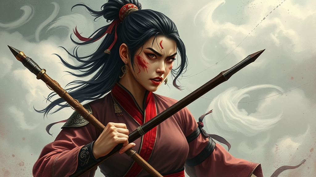 A fierce young woman with striking, traditional Chinese attire stands defiantly, her face smeared with blood, her eyes blazing with anger. She grips a spear tightly in her hand, embodying the warrior spirit of ancient Chinese mythology. Above her, the cloudy sky is depicted in intricate detail, swirling in abstract patterns that reflect the tumultuous emotions of the scene.