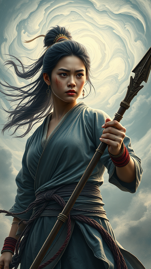 A fierce young woman with traces of blood on her face stands with intensity in her eyes, gripping a spear firmly. She emanates the strength of a mythical warrior from Chinese legends. The sky above is intricately detailed with swirling clouds, creating an abstract backdrop that adds to the drama and power of the scene.