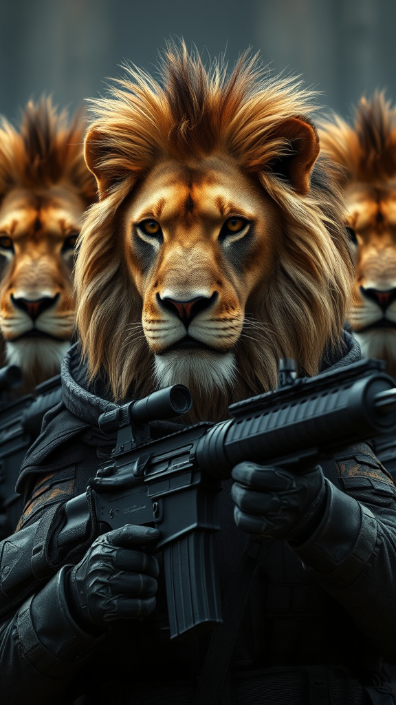 A fiercely determined, battle-worn lion army unit dressed in stealth black tactical uniforms, each gripping a modern carbine rifle, with anthropomorphic features, captured with super detailed realism in ultra hd, 8k quality. Their faces tell stories of countless battles, with striking expressions evident through maximum facial detail, all set against a backdrop of dramatic cinematic lighting. The scene emphasizes their majestic presence and unyielding spirit.