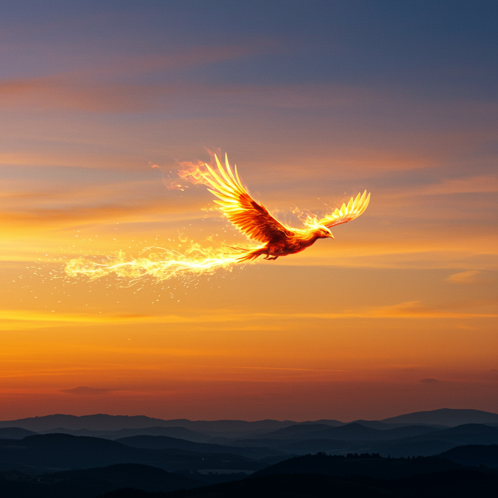 A fiery bird soars through the sunset sky, its wings casting a radiant glow as they streak across the horizon, leaving a trail of shimmering sparks in its wake.