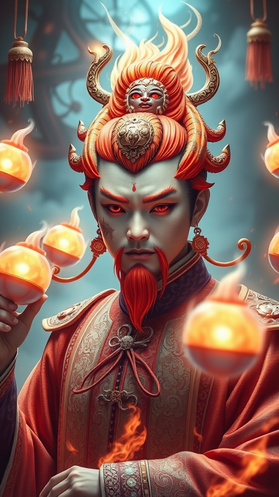 A fiery-costumed Chinese character with red eyes emerges from a fantastical otherworldly vision, captured in a hyper-detailed, realistic portrait. The character is surrounded by luminous 3D objects that contrast intriguingly against a dark bronze and light blue backdrop. Their intricate attire and features are rendered in digital airbrushing, highlighting extraordinary, lifelike details. Despite its depiction in an imaginative realm, this portrayal avoids distortions or unrealistic elements, focusing on elegance and meticulous composition. The character's posture and expression are striking yet believable, with flawless anatomy and balanced proportions, providing an immersive glimpse into this fantastical narrative.