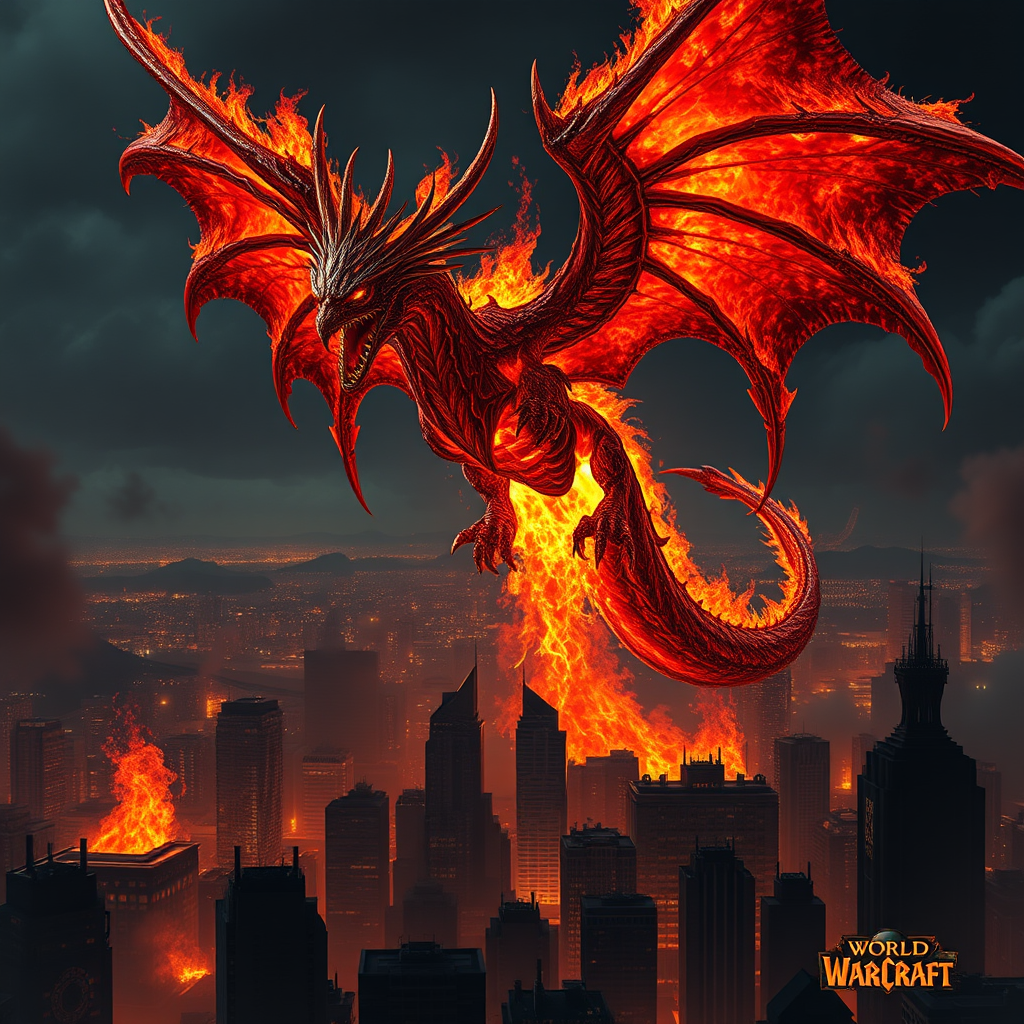 A fiery Deathwing emerges above the cityscape, engulfed in blazing flames that cast an intense glow over the darkened skyline. The scene evokes the intricate style of ZBrush with a referential painting approach, where spiky mounds of molten bronze and deep crimson textures meld seamlessly into the beast's form. The meticulous details bring the creature to life with crowcore-inspired elements, such as feathers intertwined in its scales and shadowy wings silhouetted against the inferno. The Deathwing's exaggerated expressions showcase a feral majesty and fierce intent, capturing a stunning spectacle reminiscent of Bayard Wu's dramatic artistry. The atmosphere brims with an ominous yet captivating energy, as small creative nuances enhance the core vision of this breathtaking portrayal.