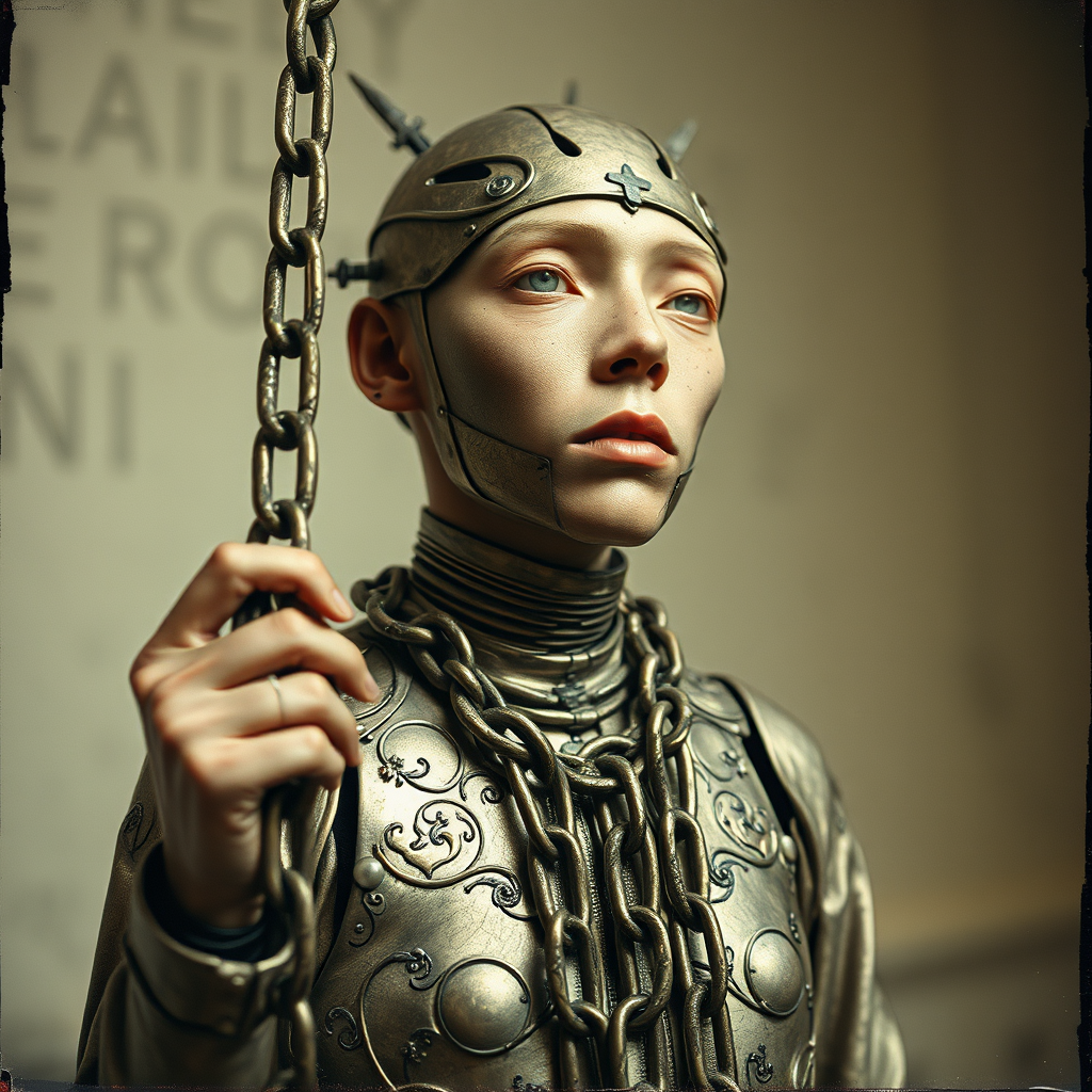 A figure clad in an intricate metal suit holding a heavy chain, captured with the ethereal quality of gum bichromate, inspired by Camilla d'Errico's surrealism, blending light bronze with subtle pink hues. Features are abstract and disfigured, as if viewed through a webcam lens, evoking a sense of religious iconography and spiritual introspection reminiscent of Donna Huanca. The scene is enveloped in a raw, unfiltered atmosphere, with elongated proportions and a hint of digital distortion.