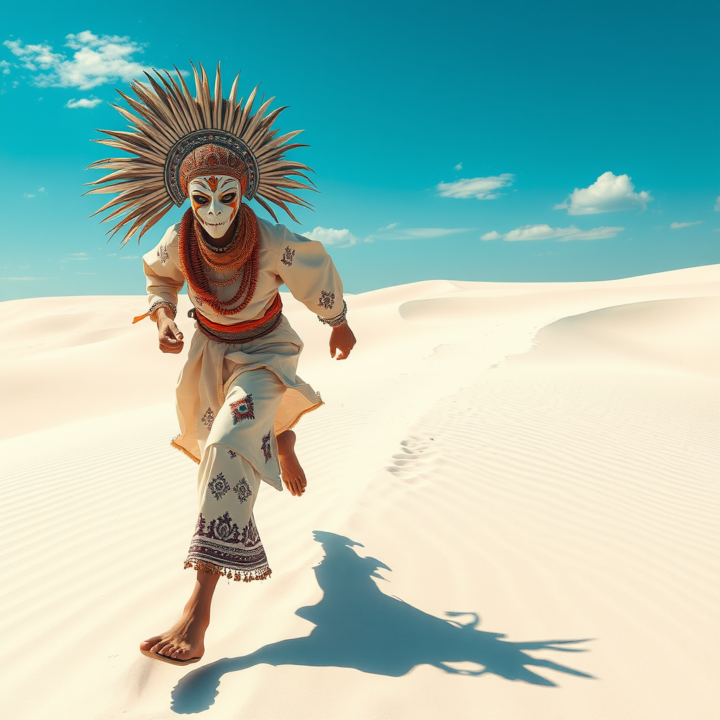 A figure dashes across a sprawling white sandy dune, his gaze locked onto the camera. He wears a pristine tribal mask that contrasts against the vivid blue sky, accompanied by oversized, flowing clothing adorned with delicate tribal patterns. The scene is painted in a whimsical spectrum of vibrant colors, evoking a sense of dreamlike wonder. The environment hints at a futuristic realm, reminiscent of Studio Ghibli’s enchanting worlds, yet infused with the sharp clarity and eccentricity of anime. The atmosphere is ethereal, with elements of both the ancient and the avant-garde intertwining seamlessly.