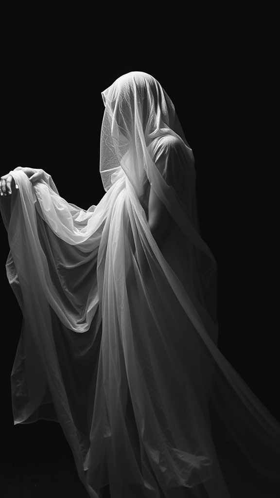 A figure draped in ethereal, gossamer-like fabric appears to dissolve into the surrounding air, creating an interplay of light and shadow. The stark contrast between the deep, dark backdrop and the luminescent, textured veil that wraps around the form evokes a sense of metamorphosis. In monochrome tones, this scene exudes a mysterious, intense aura as the person seems to transition between states of being, the material blurring the lines between the corporeal and the ephemeral.