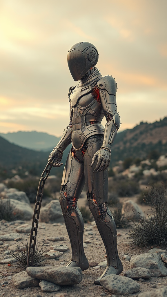 A figure encased in an intricately designed metal suit, wielding a heavy chain, emerges from a surreal landscape. The suit glows with hues of light bronze and soft pink, reflecting a unique blend of beauty and distortion. Inspired by gum bichromate techniques, the scene carries the ethereal, dreamlike quality reminiscent of Camilla d'Errico's work. Disfigured forms subtly blend into the composition, invoking a sense of fluidity and transformation. The setting feels intimate, as though captured through the lens of webcam photography, offering an immediate connection to the viewer. Religious undertones whisper through the piece, hinting at Donna Huanca's influence, merging the spiritual with the avant-garde. The overall composition retains a raw, unfiltered essence, inviting contemplation and introspection.