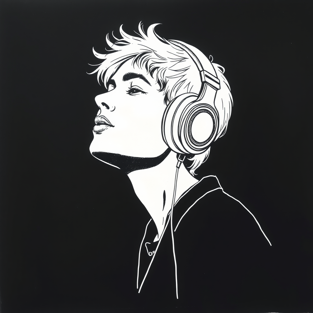 A figure immersed in music, wearing sleek headphones, illustrated with bright white ink on deep black paper, showcasing a captivating contrast and elongated aspect ratio, subtly enhanced with creative flair, maintaining an artistic and modern vibe.