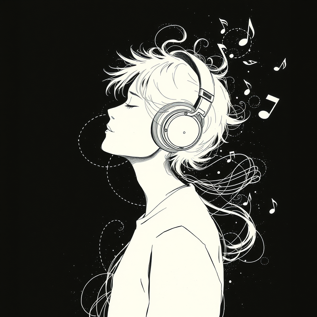 A figure immersed in sound, depicted with white ink flowing elegantly over deep black paper, wearing oversized headphones. The composition is tall and narrow, capturing a serene moment as delicate lines and intricate patterns subtly enhance the scene's depth and emotion, with a hint of musical notes woven into the background ambiance.
