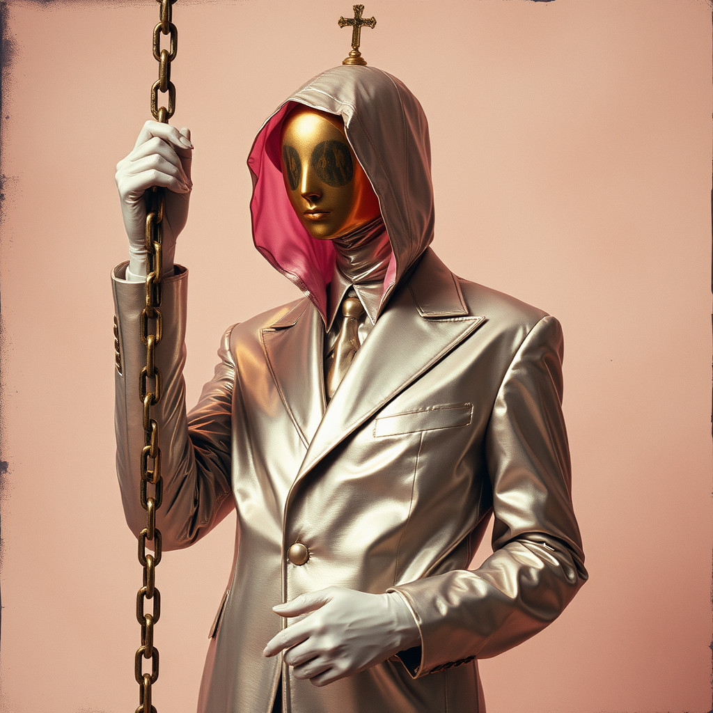A figure in a metallic suit, holding a chain, depicted with a gum bichromate effect, inspired by Camilla d'Errico, featuring hues of soft bronze and pastel pink. The forms are intriguingly distorted, reminiscent of webcam photography with elements of religious iconography. Influences of Donna Huanca are evident in the layered textures and ethereal presence, blending abstract and surreal qualities. The composition is enriched with raw, visceral style, embracing a captivating interplay of light and shadow, as it sits within a unique aspect ratio of 70:87, capturing a world of wonder in its visual narrative.