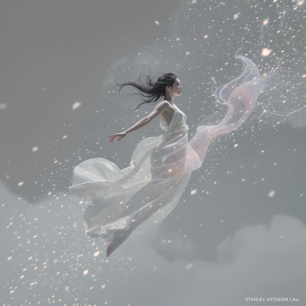 A figure moves gracefully amidst an ethereal setting, surrounded by floating particles and soft motion blur. The scene is hyperrealistic, with detailed eyes capturing every nuance in HDR and 8k clarity. The focus is sharp, revealing intricate details, reminiscent of artwork by Stanley Artgerm Lau, housed on Artstation. Light particles dance around, resembling pixies in a dreamlike atmosphere. The character floats effortlessly in space, conveying a sense of wonder. Though elements of fantasy are present, there is a harmonious balance, eliminating any distortions or unrealistic anomalies. The figure is well-proportioned, with each feature carefully rendered to ensure a visually appealing and captivating image.