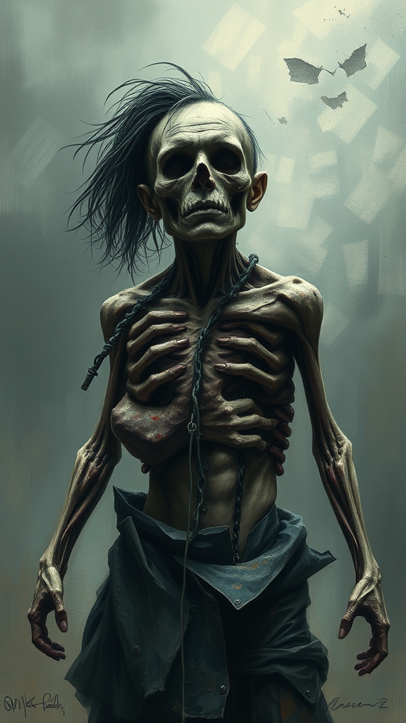 A figure stands defiantly against a gloomy backdrop, embodying the spirit of "broken but ready to fight." The scene is composed with epic intensity, blending brutal and cinematic elements in a dramatic digital painting style reminiscent of expressionism. The emotionally charged close-up ensures an unforgettable impression, delivering high-quality visuals. Yet, imperfections abound—jpeg artifacts blur the image, with visible mutations and deformities, an expression of struggle and perseverance. The anatomy is flawed, proportions exaggerated, with extra and missing limbs reflecting a surreal battle. The facial features are distorted, hands poorly sketched, conveying an otherworldly, morbid allure. The elongated neck and degraded details reveal hidden depths of resilience. Scattered across the canvas are reminders of its digital origin: a camera logo, watermarks, signatures, all subtly integrated into this raw portrayal of enduring human spirit amidst chaos and imperfection.